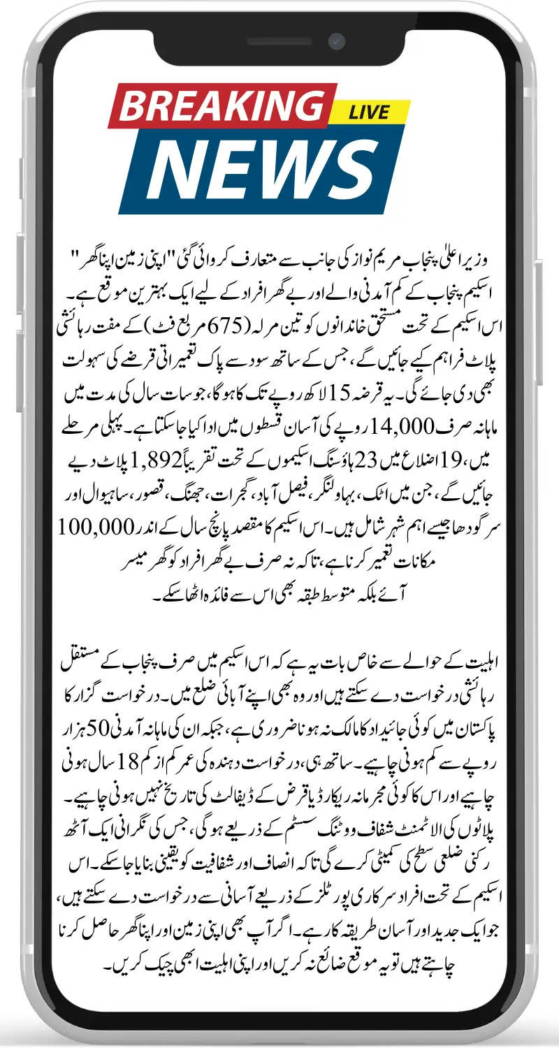 Finally, Punjab Chief Minister Maryam Nawaz Sharif has formally launched the Apni Zameen Apna Ghar Scheme 2025. Which aims to provide an opportunity to the landless and homeless people of the province to live a dignified life. Under this scheme, free 3 marla (675 square feet) residential plots will be given to 1892 deserving families in the first phase in 19 districts of Punjab. The Chief Minister announced during the scheme ceremony that this is just the beginning, in the future this scheme will be extended to all districts of Punjab so that deserving people across the province can benefit from it. The most important thing is that this scheme is not limited to providing plots only, but interest-free loans will also be given for building houses which can be repaid in easy installments over 7 years.